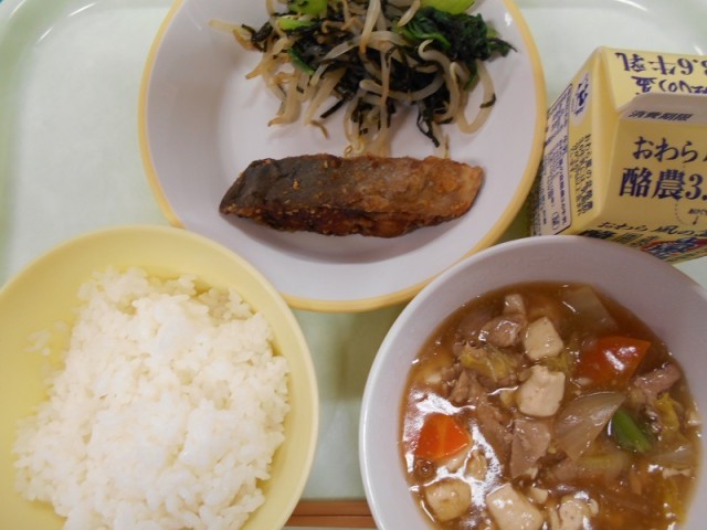 ごはん 牛乳 ふくらぎの竜田揚げ 磯和え 豆腐と野菜のうま煮