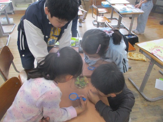 授業参観の日に生まれたモンシロチョウの幼虫がすくすくと育っています。「13日間でこんなに大きくなるなんてびっくりしたよ」「キャベツをたくさん食べているね」「少し体に毛が生えているよ」と観察して、たくさんのことに気付いていました。