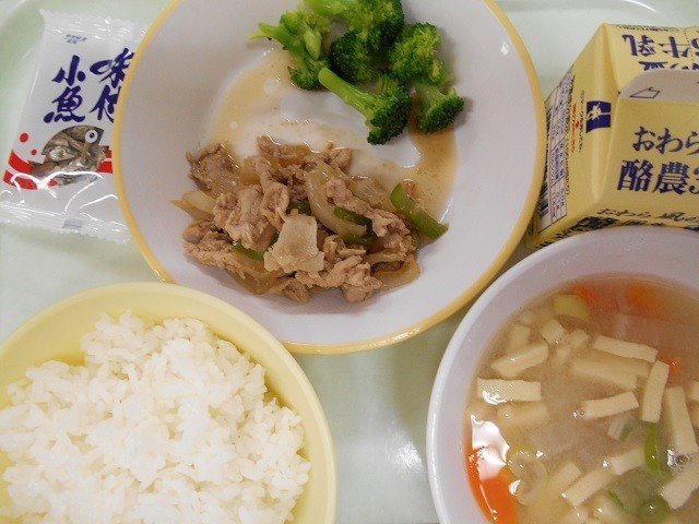 ごはん 牛乳 焼肉 ゆでブロッコリー みそ汁 味付け小魚