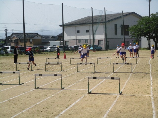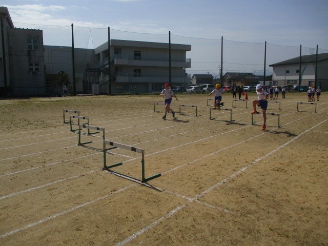 体育では、ハードル走の学習をしています。今日は、自分に合うインターバルを見付けることを目標に練習しました。これからの学習で、歩数やリズム、姿勢を意識して走ることができるといいですね。