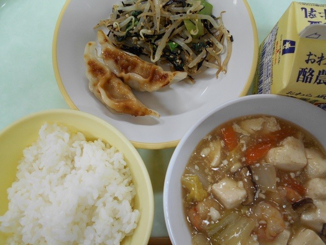 ごはん 牛乳 焼きぎょうざ 小松菜とひじきのナムル えびと豆腐のうま煮