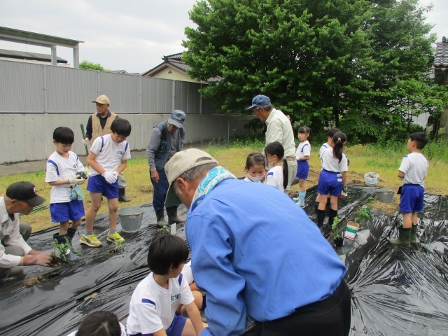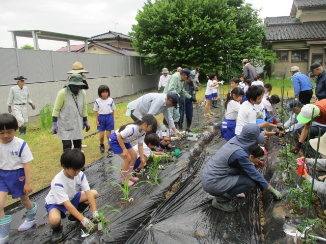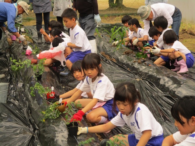 老人クラブのみなさんに協力していただき、自分で育てると決めた野菜の苗を畑に植えました。「大きくて立派な野菜になってほしい」「あまくておいしい野菜になってほしい」と願いを込めて植えました。