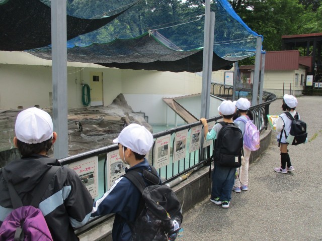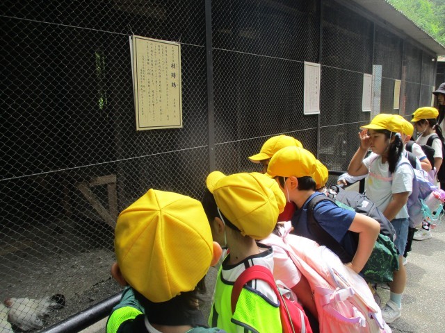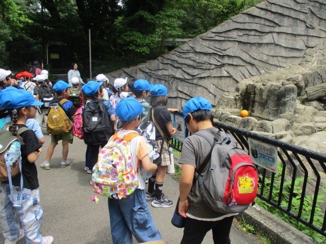 午前中は班ごとに決めた順番で動物を見て回ったり、全員で並んで歩きながら動物を見たりしました。「かわいい」「昼寝してるね」と友達同士で話しながら歩きました。