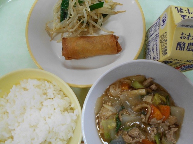 ごはん 牛乳 春巻き 塩ナムル 八宝菜