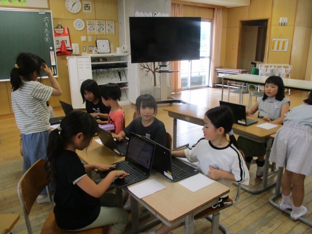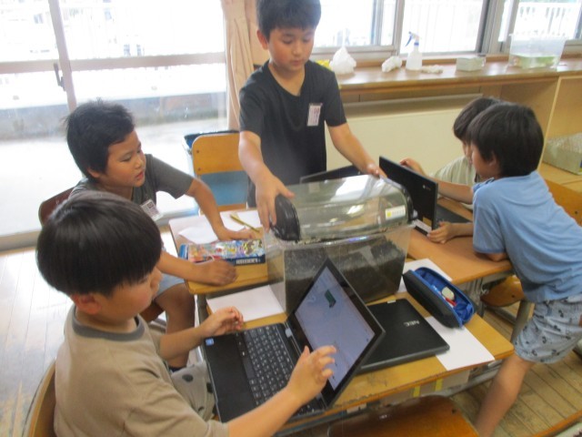 生活科の学習で生き物と友達になるためにはどうしたらよいか考えました。「生き物のことをもっと知る!」「触ってみる」「お家をよくする」など子どもたちらしい考えがたくさん出ました。クラスにいる川エビ、幼虫、クワガタ、グッピーの4チームに分かれ、生き物を観察したり、調べて分かったことをカードに書いたりしました。