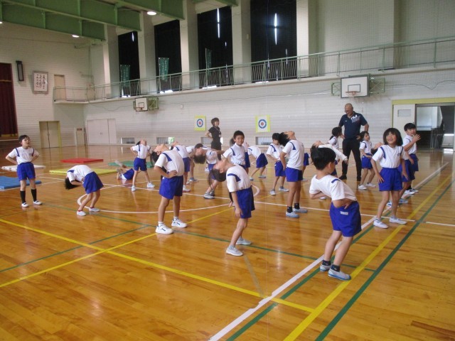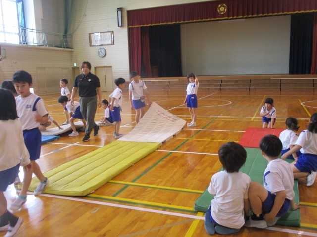 体育科の学習でスポーツ指導員さんをお招きし、マット運動に取り組みました。話をよく聞き、準備運動をして、みんなでマットを準備し、いざ、スタート!