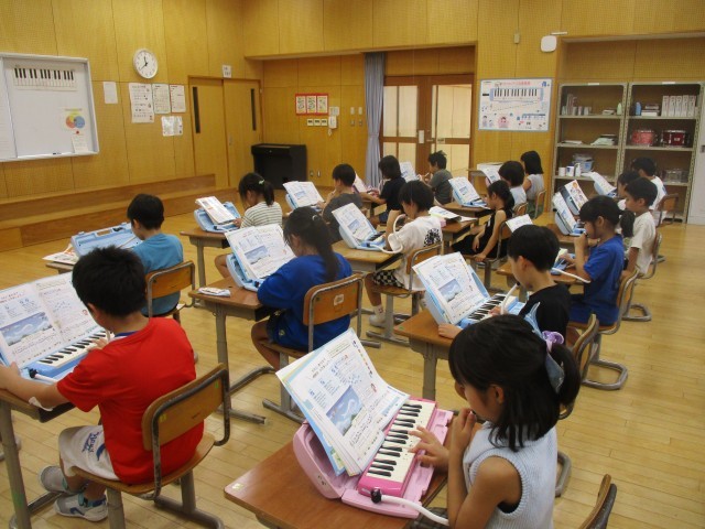 音楽の学習が大好きな子どもたち。元気に楽しんで歌を歌ったり、リズムに気をつけて鍵盤ハーモニカを演奏したりしています。今日はぷっかりくじらという曲に合わせて、鍵盤ハーモニカをリズムよく吹きました。