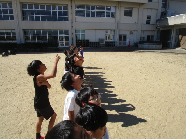 物語の中で出てくる「かげおくり」という遊びを実際にみんなでやってみました。片足をあげたかげおくり、両手をあげたかげおくり、様々な形のかげおくりを行う子供たちでした。実体験を通して物語を読み深めていってほしいと願っています。