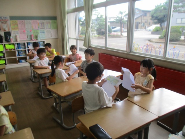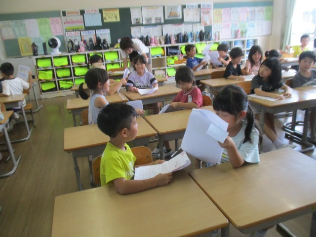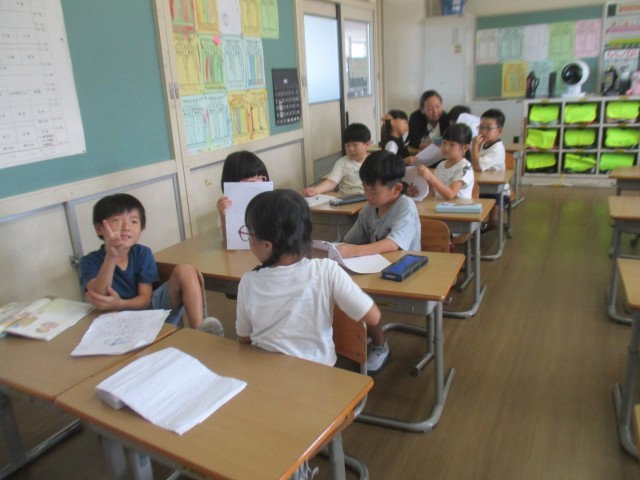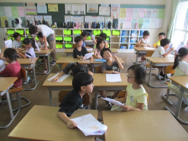 国語科「こんなこと したよ」は、夏休みの思い出等について発表する学習です。今回は、夏休みの宿題だった絵日記から伝えたい話題を一つ選び、ペアでの発表やグループ発表を行いました。