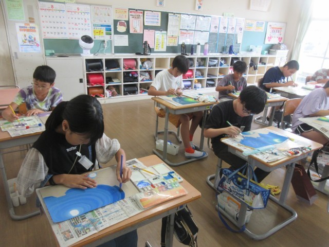 「百羽の鶴」のお話の絵を描いています。月と空の色を塗りました。