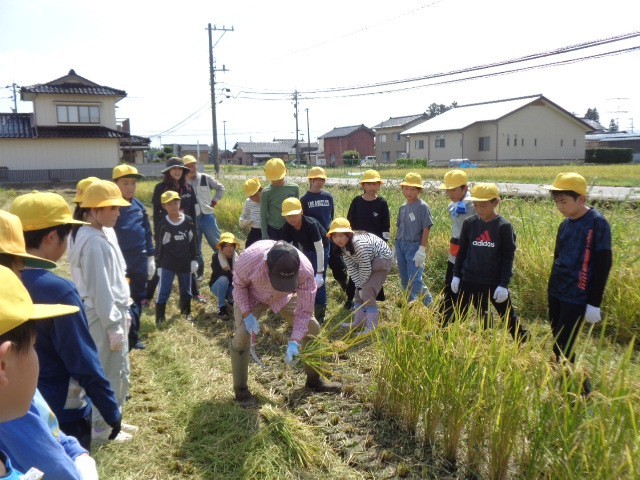 5月に田植えをした田んぼで、稲刈りを体験しました。