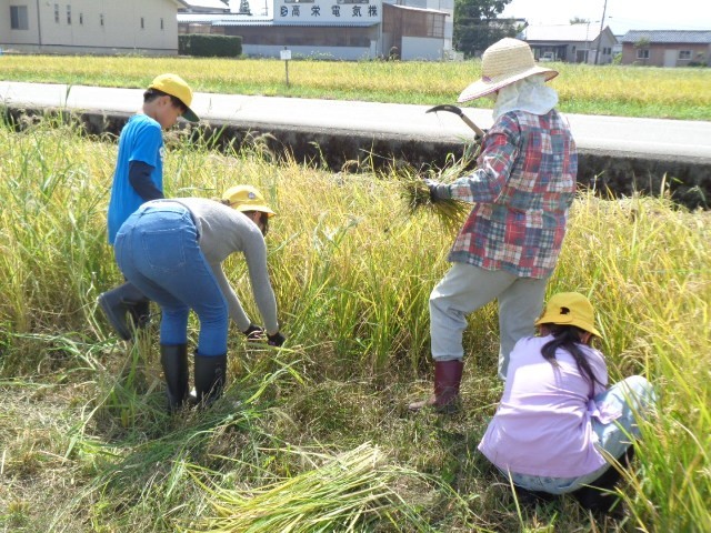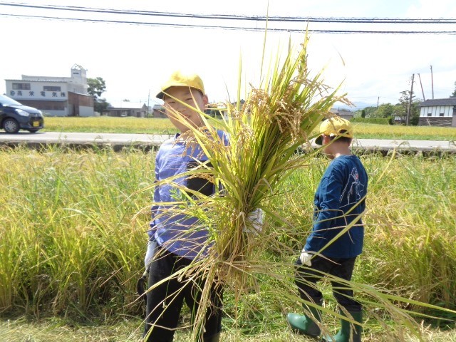 日差しが強く暑い中での作業でしたが、手作業の大変さを感じながらも楽しんで行いました。たくさん実っていた稲も、みんなの力でほとんど刈りとることができました。