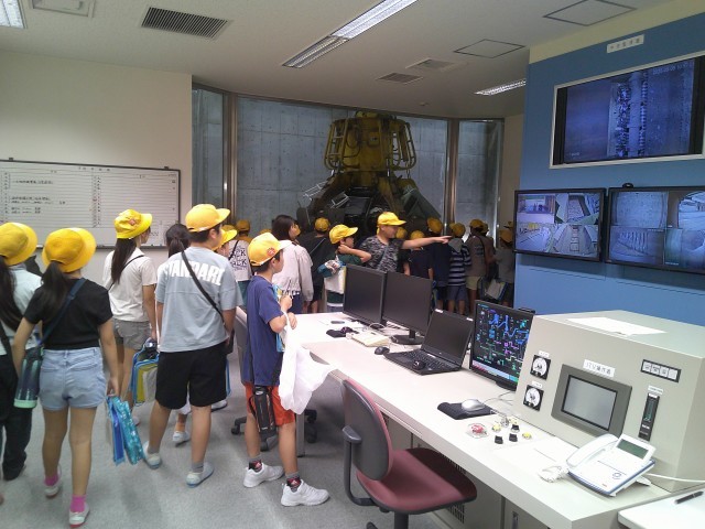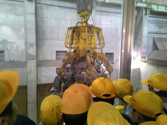 見学中に、プラットホームにごみ収集車が入ってきて、車の中にあるリサイクルごみをごみピットに入れるところを実際に見ることができました。空き缶や空き瓶がピットに入ると、とても大きな音がして、子供たちは驚いていました。粗大ごみを粉砕する機械やつぶされて固められた空き缶等、初めて見るものばかりでした。