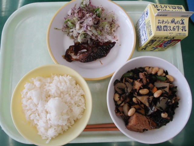 7月11日(木)の給食 公開日 2025/09/11 更新日 2025/09/11 今日の給食 今日の献立は、ごはん、鯵のみりん焼き、ゆかり和え、大豆の磯煮、牛乳です。ゆかり和えでは、乾燥させた赤しそが使われています。赤しそは栄養豊富なだけでなく、その香りは胃液の分泌をよくし、食欲を増進させる働きがあるそうです。しそ風味のキャベツともやしをおいしくいただきました。