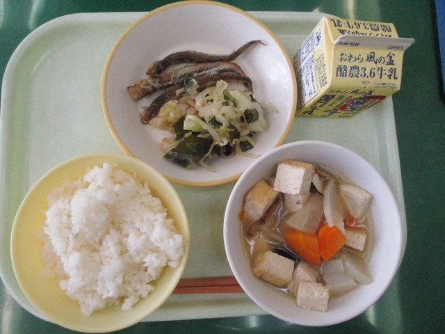 今日の献立は、ごはん、ししゃもの米粉揚げ、わかめサラダ、みそけんちん汁、牛乳です。