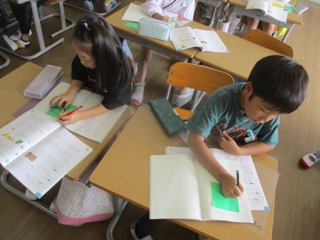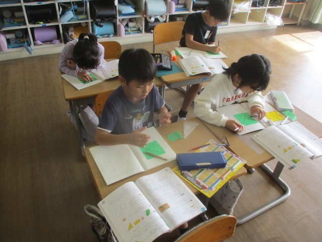 算数では、色紙を切って長方形と正方形を作り、辺の長さや角の形を調べました。「どちらも角は直角になっている」「長方形のときはたてと横の辺の長さが違ったけど、正方形は同じだったよ」と調べて気付いたことを友達に伝えていました。