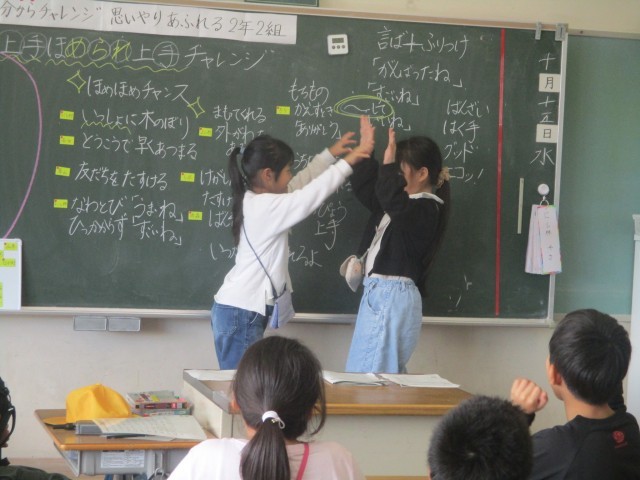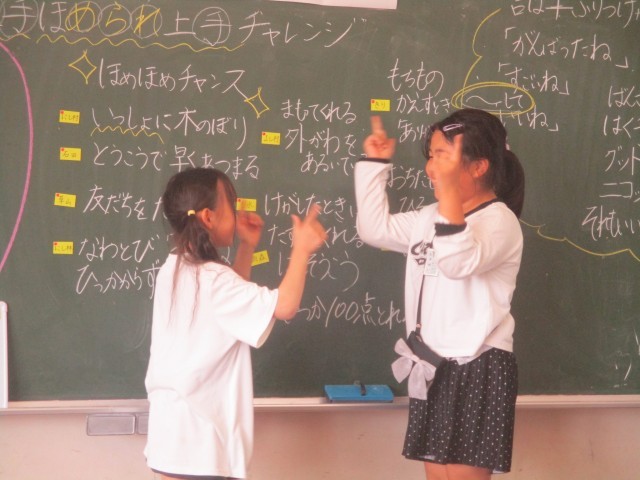 10月の神保っ子の目当て「正しい言葉、ぽかぽか言葉を使おう」を達成できるように、「ほめ上手、ほめられ上手にチャレンジしよう」という学習を行いました。どんなときにどのようにして褒められると嬉しいかを考え、様々な褒め方を実践しました。互いに褒め合うことで、嬉しい気持ちになったり、笑顔になったりすることに気付く子供たちの姿が見られました。
