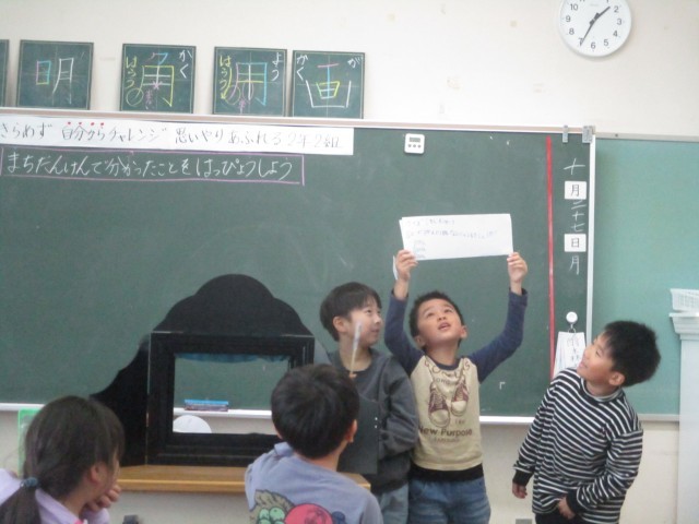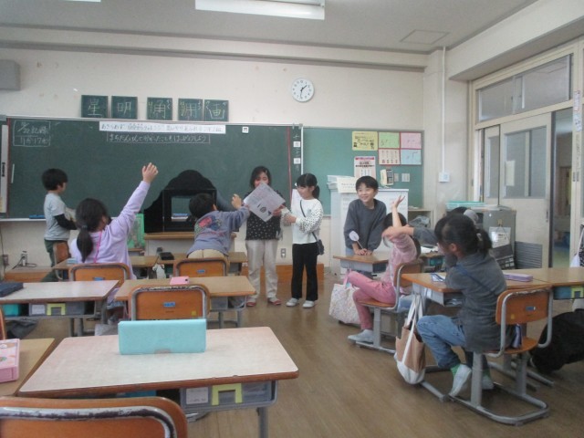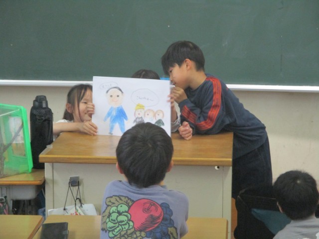 生活科の学習で、町探検で分かったことをクラスの友達に伝える活動をしました。今回は、「駐在所・地区センター」チームと「千里ショップ・郵便局」チームが発表を行いました。どちらのチームもクイズや紙芝居、ペープサート等を用いながら、伝えたいことを楽しく伝える姿が見られました。これからも神保のすてきを発見していってほしいと思います。
