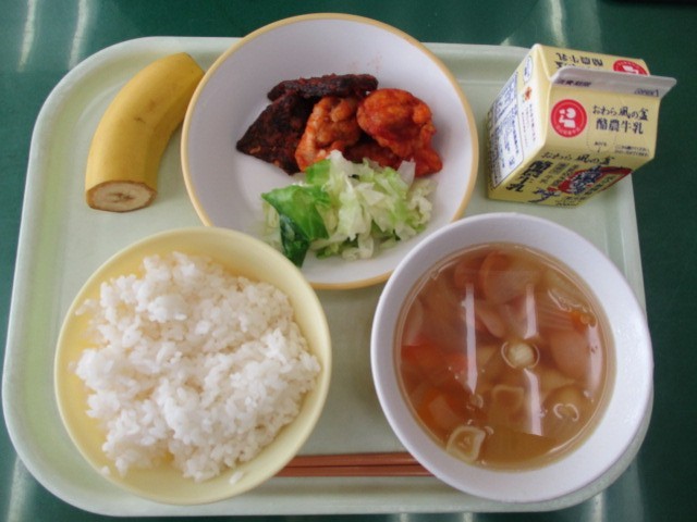 10月29日(水)の給食 公開日 2025/10/29 更新日 2025/10/29 今日の給食 今日の献立は、ごはん鶏肉とレバーのケチャップからめ、ゆでキャベツ、マカロニスープ、バナナ、牛乳です。 レバーは子供たちが食べやすいように、香ばしく揚げて、ケチャップとウスターソースで味付けされています。 今日も、おいしくいただきました。