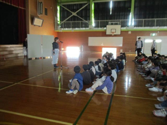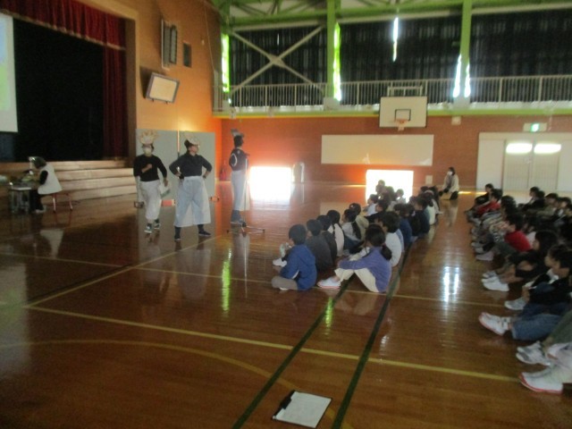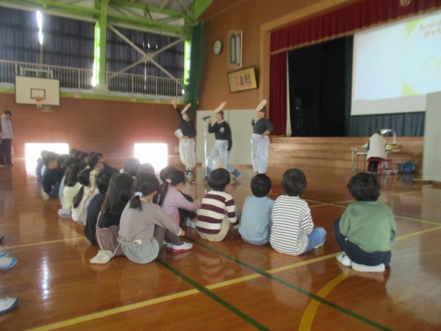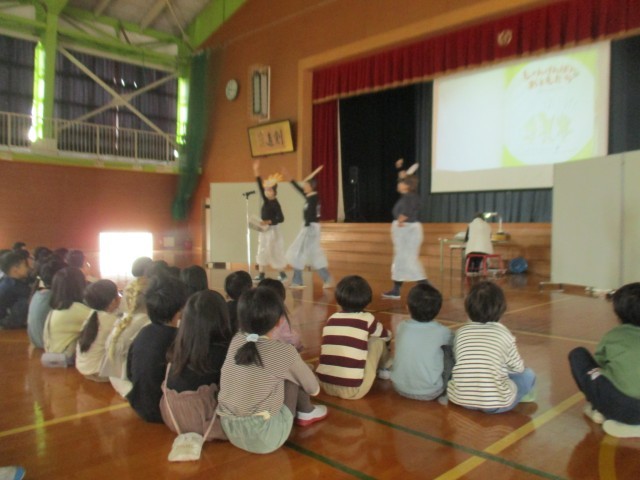 読書ボランティア「ひだまりの会」の方々による朗読劇「じゃんけんぽんのおともだち」を見せていただきました。スクリーンに大きく映し出された絵本と朗読、そして演劇に子供たちは物語の世界に引き込まれていました。