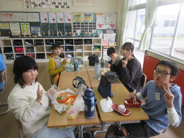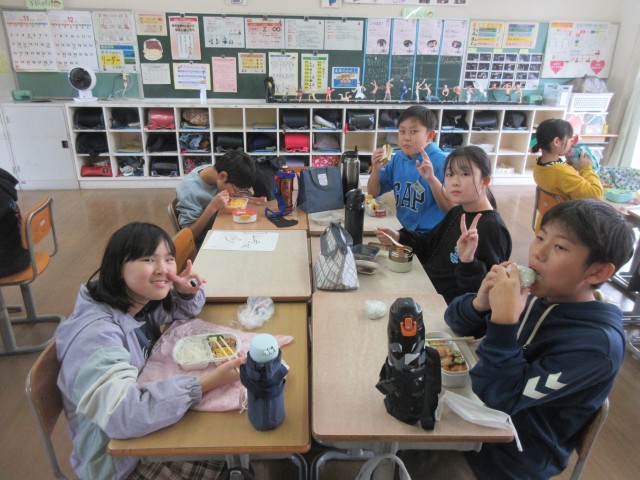 6年生 お弁当 公開日 2025/11/12 更新日 2025/11/11 6年生 10日(月)に予定していた「富山市チャレンジ陸上記録会」は天候不良のため、中止となりました。6年生は記録会に向けて準備や練習をしてきたため、大変残念な思いでした。お昼は、おうちの人に用意してもらったお弁当のおかげで、とても楽しい雰囲気で過ごしました。