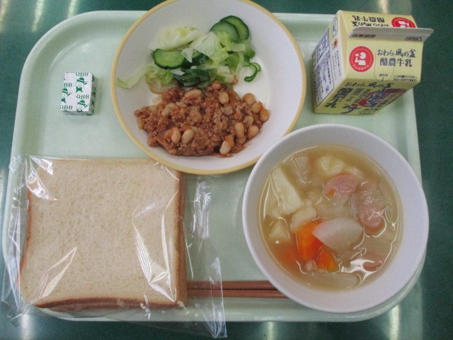 11月21日(金)の給食 公開日 2025/11/21 更新日 2025/11/21 今日の給食 今日の献立は、食パン、チリカンコン、添え野菜、野菜のスープ煮、ポケットチーズ、牛乳です。 コンソメ味のスープが、大根やにんじん、ジャガイモによくしみていました。 今日も、おいしくいただきました。