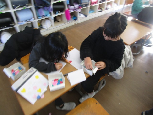 3年生の外国語活動では、ALTの先生と一緒に「英語で相手に欲しいものを訪ねたり、伝えたりする」ことを外国語で練習をしています。欲しい形を伝えて、いろいろな形を集めることで、おうちの人に向けた「Thank youカード」を作っています。友達同士で「What do you want?」と尋ねたり、「Star please」と答えたりしています。
