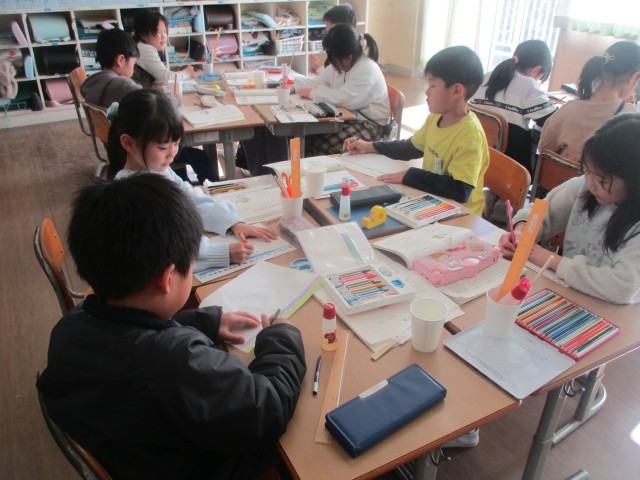 国語「紙コップ花火の作り方」の学習で、文章を読みながら実際におもちゃ作りをしました。文章のどこに気を付けて作ったらよいか考えながら、グループの友達と協力して作ることができました。
