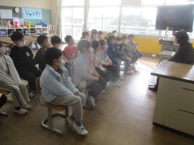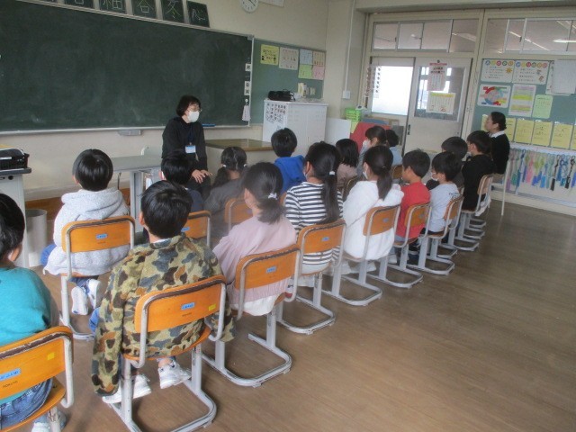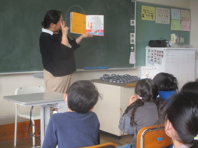 婦中図書館の方をお招きし、ストーリーテリングやブックトークをしていただきました。ストーリーテリングでは、図書館の方の語りのみでお話が進み、子供たちは真剣に聞いていました。ブックトークでは、テーマに沿った本を何冊か紹介していただきました。1組のテーマは「顔」。人間や動物の鼻の話や、耳かきが好きな王様の物語等、顔にまつわる本に興味津々の子供たちでした。