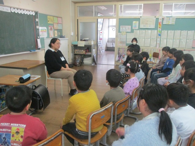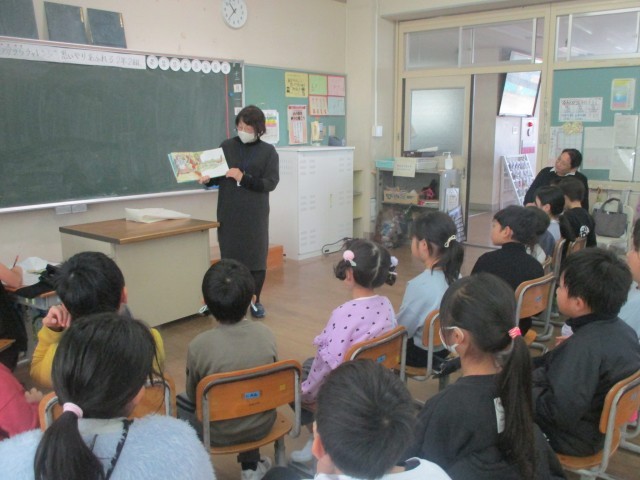 婦中図書館の方をお招きし、ストーリーテリングやブックトークをしていただきました。ストーリーテリングでは、図書館の方の語りのみでお話が進み、子供たちは話の展開にドキドキしながら聞いていました。ブックトークでは、テーマに沿った本を何冊か紹介していただきました。2組のテーマは「のぞいてみると…?」。絵本に登場するきつねがもっている袋の中や、椅子や針山等の身近な物の中、からだの中等、本を通して目には見えないものを楽しみながら想像することができました。