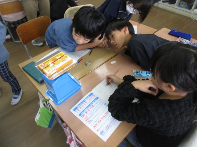 3年生では算数科で重さの学習をしています。はかりを使って細かい目盛りを読むことで重さを計っています。また、重さの見当をつけてから計ってみることで、「見当をつけたことと全然違う重さで驚いた」「次は自分の筆箱を計ってみたい」と感想をもっている子供たちでした。