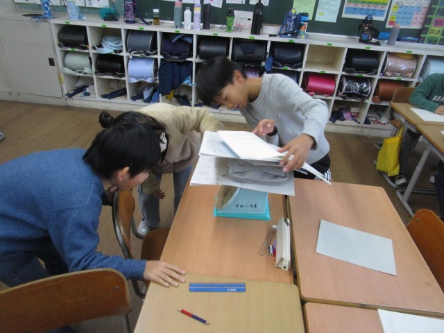 3年生では、算数科で「重さをはかってはかって表そう」の学習をしています。グループで協力してちょうど1kgの重さをつくっています。筆箱やノート、鉛筆1本を組み合わせて1kgをつくる子供たち。出来上がった1kgを持ち上げて「思ったよりも軽いんだね」と重さの感覚を養っていました。