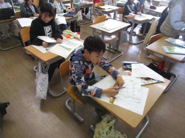 国語科「すがたをかえる大豆」では、大豆以外にもすがたをかえる食材のひみつを調べています。学習したことを生かして、調べて分かったことを、「はじめ」「中」「おわり」に分けてまとめています。