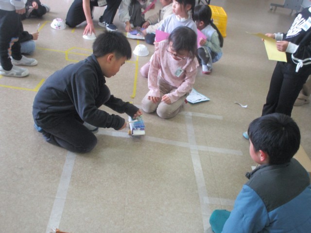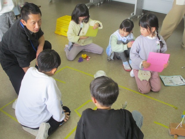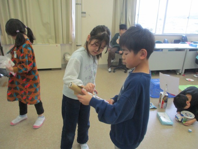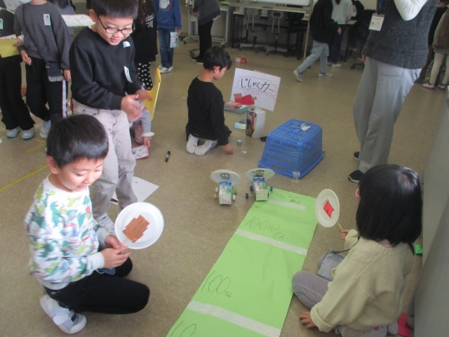 1年生さんに教えるときは、言葉だけでなく、実際に見本を見せて工夫しながら伝えていました。また、1年生さんが上手くできたときに「すごい!」と場を盛り上げたり、お休みの友達が作ったおもちゃも遊んでもらえるように、呼びかけたりする姿も見られました。写真は、「かさぶくろロケット」「ゴムロケット」「びゅんびゅんカー「じしゃくカー」「コトコト車」「パタパタカー」の様子です。