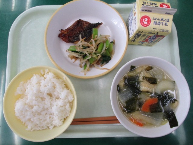 今日の献立は、ごはん、さばの塩焼き、しょうがひたし、みそ汁、牛乳です。