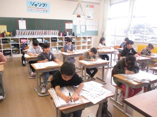 また、始業式後に行われた書き初め大会では、今までの練習の成果を発揮しようと、一字一字丁寧に集中して書いていました。