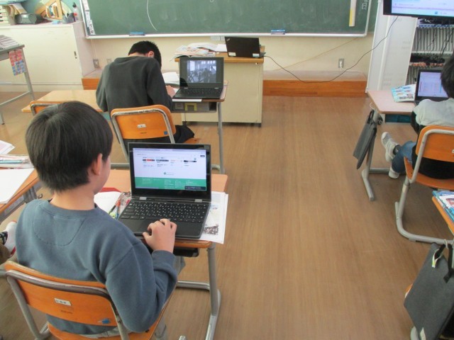 【6年生】 社会科の学習 公開日 2026/01/30 更新日 2026/01/30 6年生 社会科では、戦後の時代について学んでいます。クロムブックや教科書を使って調べ、ノートにまとめています。次回からは、戦後の改革について、話合いをしていきます。