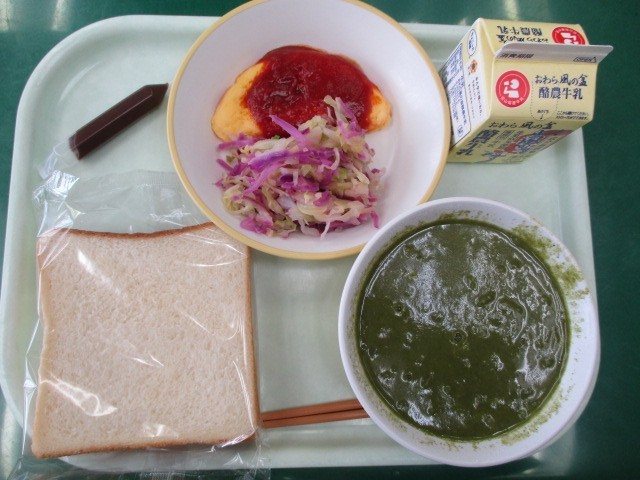 今日の献立は、食パン、牛乳、オムレツのトマトソースかけ、むらさきキャベツのマリネ、ほうえれんそうのポタージュ、チョコペンです。