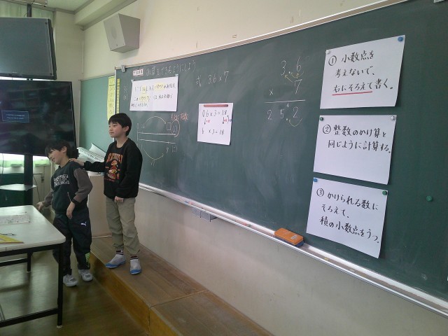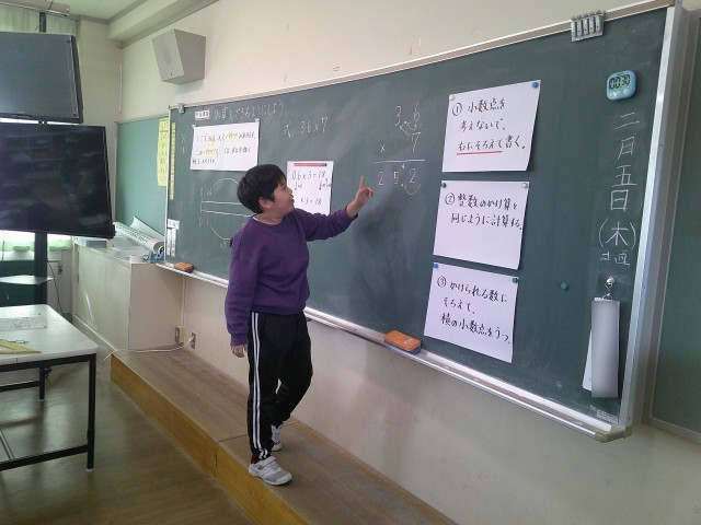 【4年生】小数のかけ算 筆算の仕方を説明しよう 公開日 2026/02/05 更新日 2026/02/05 4年生 算数では、小数のかけ算を学習しています。今日は、小数のかけ算の筆算の仕方を考えました。仲間と言葉をつなぎ、説明することができました。