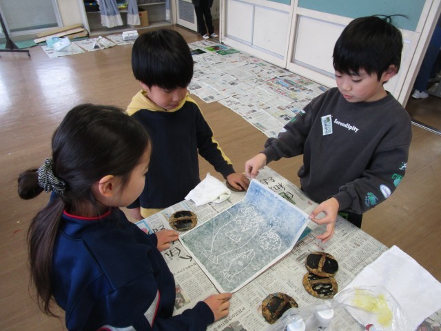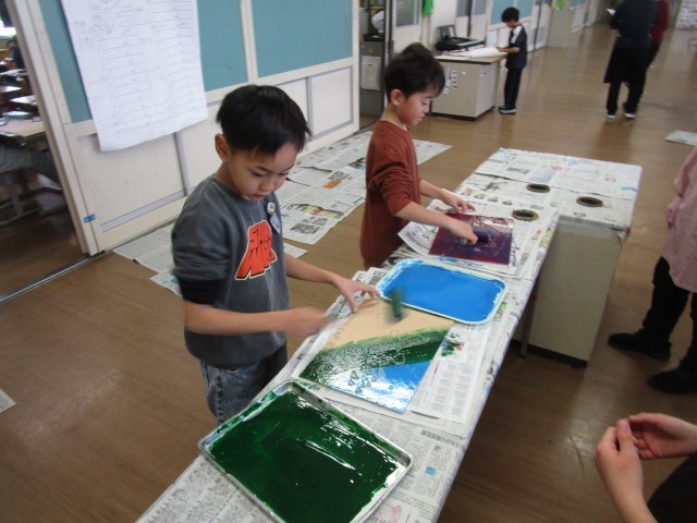 図画工作科では、これまで国語科で学習した物語の世界を版画で表しました。今回は多色版画に挑戦しました。小奉紙を板にかぶせるときには、二人で息をそろえて作業をしていました。