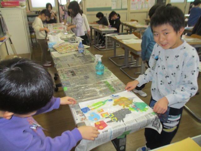1年生では、インクシールを使った版画に挑戦しました。