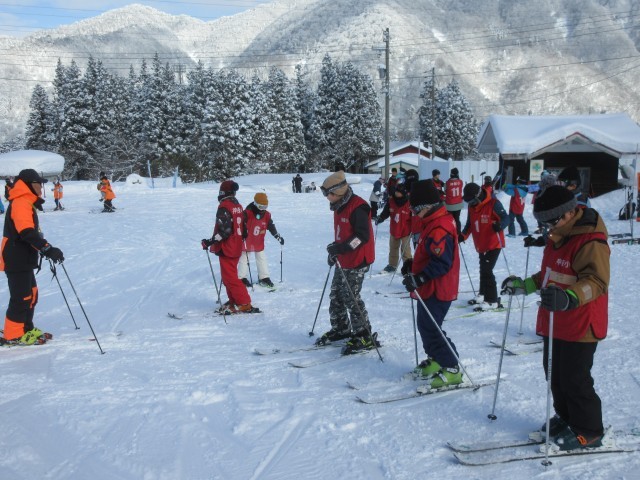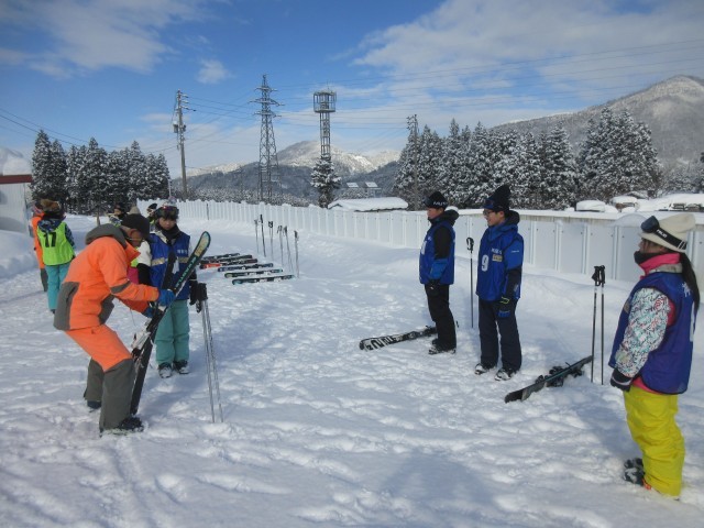 晴天の中、スキー教室が始まりました。班毎で、インストラクターの先生の話を聞き、準備運動を行っています。
