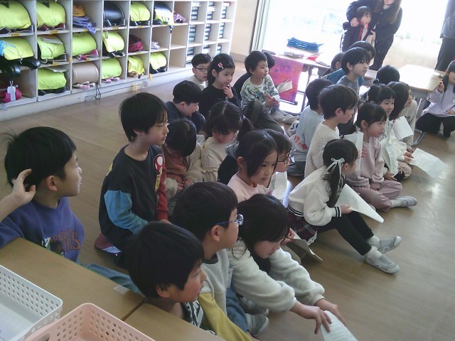 まず、国語科「いいこといっぱい1年生」で子供たちが書いた作文の発表を聞いていただきました。5月から平仮名の勉強を始めた子供たちが、今では立派に自分を振り返る文章を書き、伝えることができました。