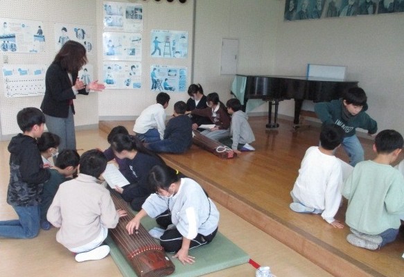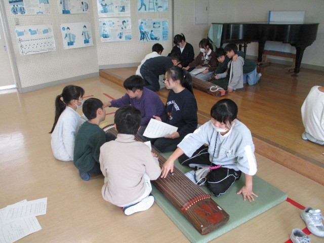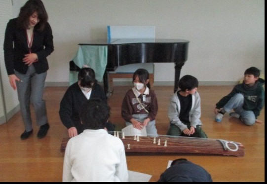 4年生は、音楽科「日本の音楽でつながろう」の学習で、琴の体験をしました。琴の演奏の仕方を学んだ後、実際に琴にふれ、「さくらさくら」の演奏にチャレンジしました。