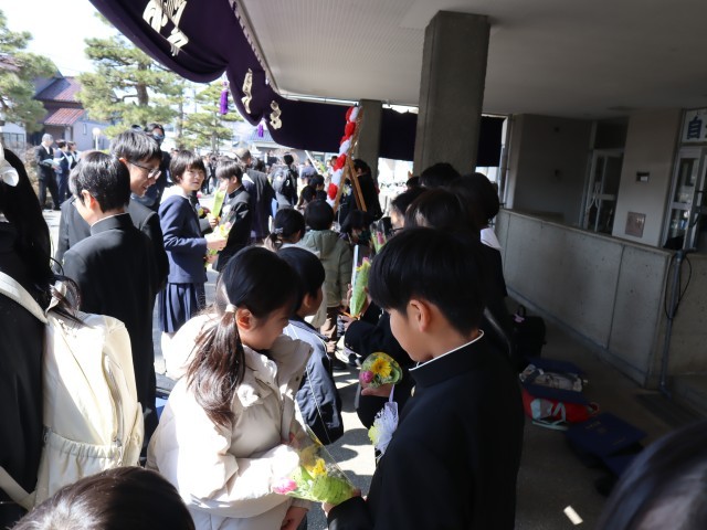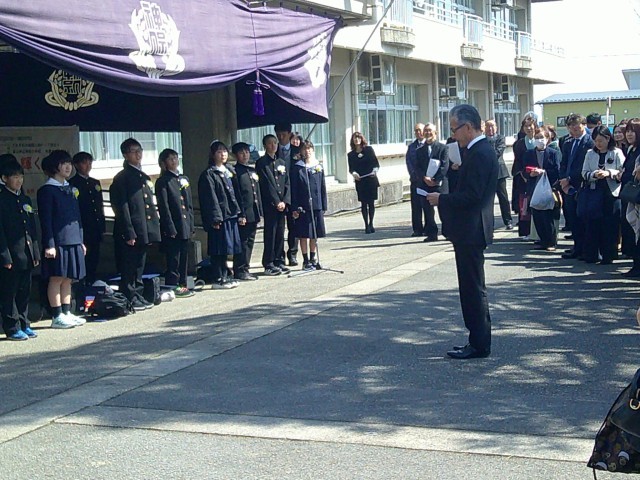 卒業式の後、玄関前で門出の式がありました。卒業生代表の言葉、来賓の方からのご挨拶、在校生からの花束渡しがありました。