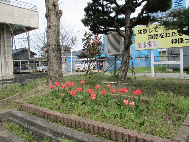 柔らかな春の光が降り注ぎ、学校の周りの景色もすっかり春色に染まりました。 子供たちの進級、入学を祝うかのように、グラウンドの桜は見頃を迎え、チューリップも鮮やかに顔をのぞかせています。