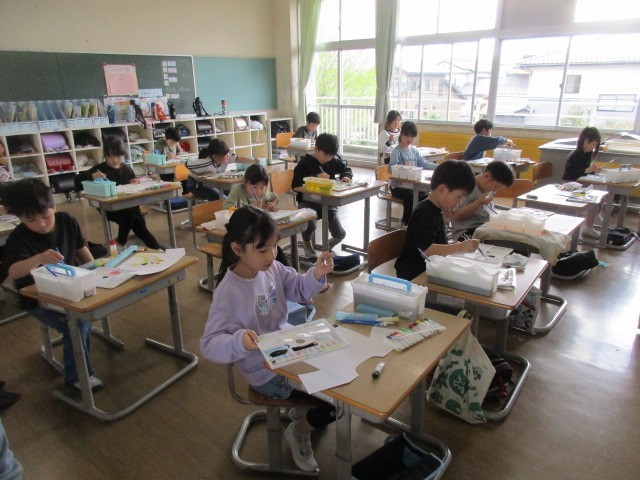 【3年生】図画工作科「オリジナルTシャツを作ろう」 公開日 2026/04/16 更新日 2026/04/16 3年生 3年生になって1回目の図画工作科の授業がありました。絵具を使って、Tシャツ型の画用紙に自分の好きな模様を描きました。水の量を変えて色の濃淡をつけたり、筆使いを工夫して動きのある模様をつけたりしていました。色とりどりの素敵なTシャツが仕上がりました。