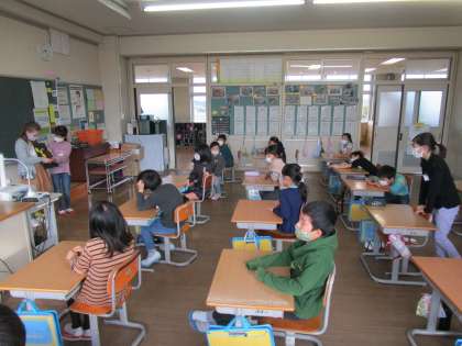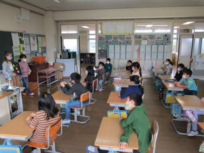 ハーモニー係が作った「What's this?」クイズを楽しみました。外国語活動では動物を取り上げていますが、ハーモニー係では他の物についてのクイズを考えてくれています。穴を開けるところを工夫し、みんなが楽しんでくれるようにしてくれました。ウインドゥが開くたびに、分かる人が増え、みんなも楽しんでいました。