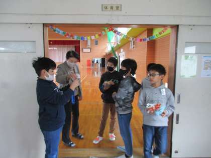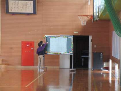 今日までの努力の積み重ねを発揮した一日。体育館の入り口や学校づくり委員会が作成したプログラム等に、さらに飾り付けをしてきれいにしていました。