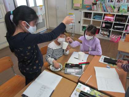 算数科「重さをはかって表そう」の学習では、重さを数で表す方法を考え調べました。1円玉をもとにすると、文房具はどれだけと表せるかを予想しながら、友達と助け合い、測っていました。